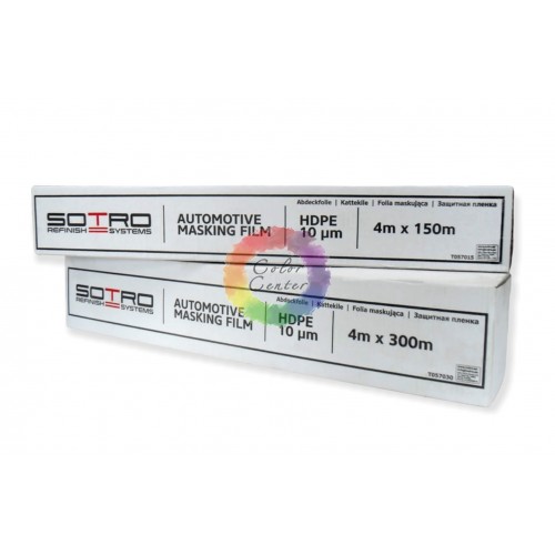 SOTRO Пленка защитная  в рулоне, 4м х 150м Пленка защитная  служит для защиты не окрашиваемых частей кузова во время проведения малярных работ. Ширина пленки позволяет одному человеку быстро и точно накрыть весь автомобиль. Устойчива к влажности и высоким температурам (до 110° C). Пленка полностью статична, что позволяет хорошо принимать любую форму кузова, не оставляя свободных полостей. Устойчива к отшелушиванию нанесенного путем распыления лако-красочного материала. Правильное укладывание пленки - надпись с наружи!  Доступные виды:   T057015 – 4м x 150м (HDPE, 10 мкм)  T057030 – 4м x 300м (HDPE, 10 мкм)  Преимущества применения пленки:  пленка облегчает маскировку автомобиля перед покраской;  сокращает время, необходимое для защиты кузова; уменьшает количество использованных покрасочных лент; точно повторяет форму кузова; - притягивает сухую покрасочную пыль металлической базы; легко удаляется с автомобиля после покраски; сокращает объем отходов