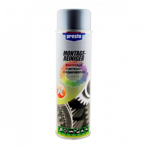 Presto Очистетель-обезжириватель монтажный, 500 мл  – высокотехнологичное средство, способное за несколько минут убрать с поверхности деталей автомашины остатки технического масла, жира, отработки нефтепродуктов. Вещество создает довольно сильный антикоррозийный эффект на металлической поверхности рабочих элементов. очиститель не пригоден для обработки клемм аккумулятора, т.к. характеризуется производителем, как диэлектрик. Усовершенствованная конструкция емкости очистителя-обезжиривателя Presto гарантирует узконаправленную струю вещества при использовании. При этом, благодаря дополнительному давлению в емкости, средство можно с успехом применять абсолютно в любом положении, что очень удобно для обработки труднодоступных деталей машины.
